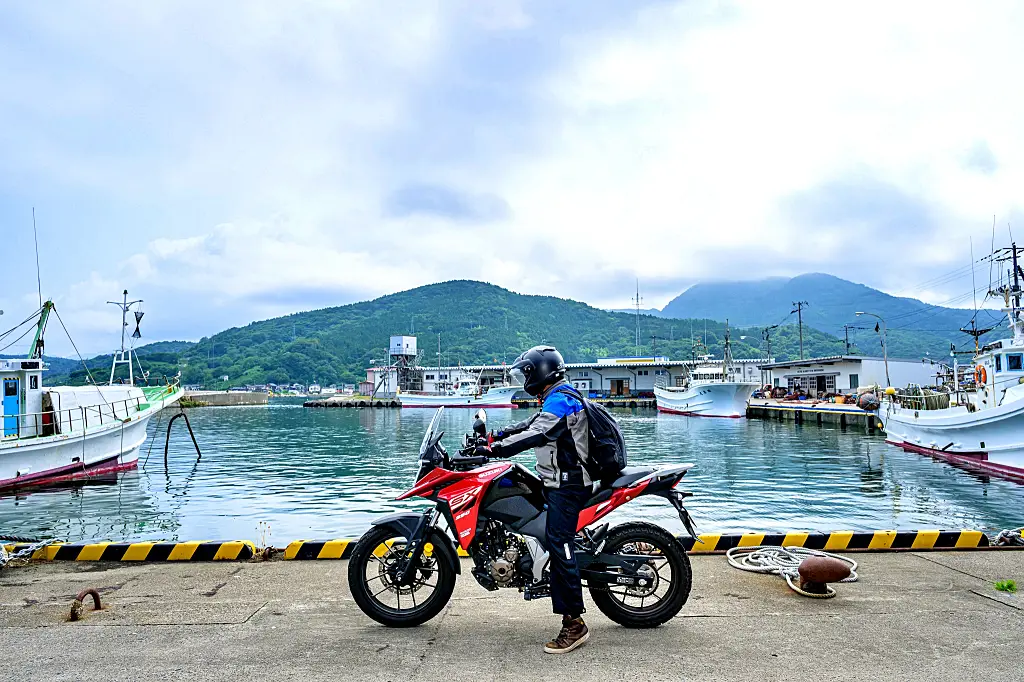 山形県鶴岡市の加茂漁港にて。県境の鼠ヶ関を出発し、日本海の海岸美を見ながらここまでやってきた[ツーリングマップル東北 P.43 K-3]