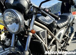 乾いた甲高い音、実際に「壊れてるよ!?」と指摘されたこともある白煙・・・ツインエンジンが織りなす不等張サウンドは「これぞバイクだ」という存在感があります。暖気運転後、発進のためクラッチレバーをしっかり握りこむと、乾いたエンジン音と乾式クラッチの擦れ合う金属音が混ざりあっていきます。この状態を若者言葉でいうと「エモい!」ということではないでしょうか。