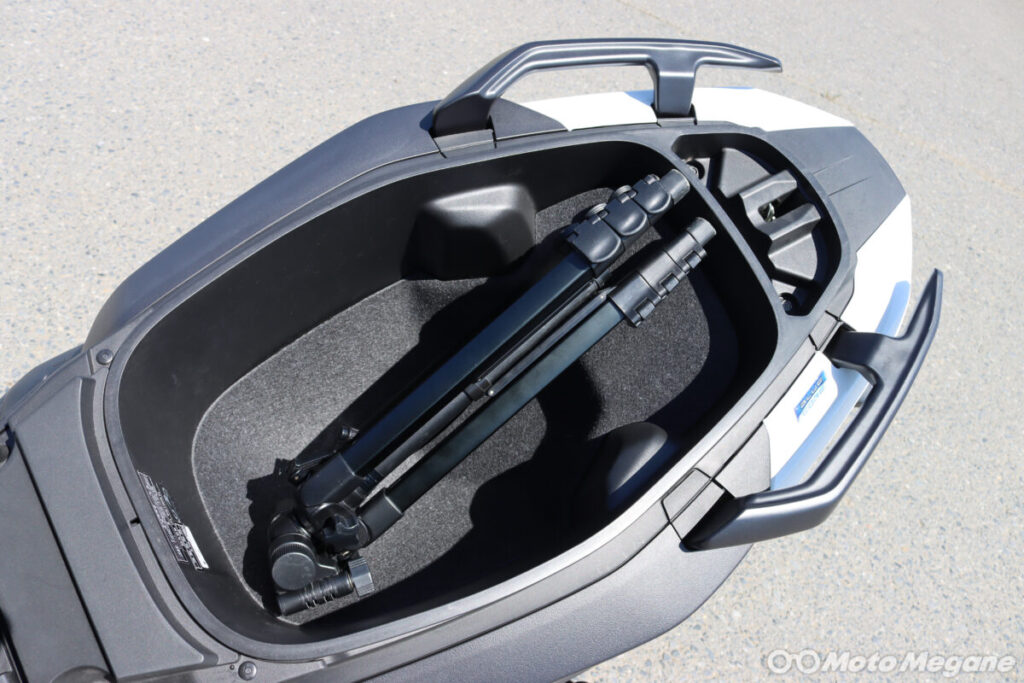 シート下の収納容量は変わりなし。三脚も入るほどのスペースがある。