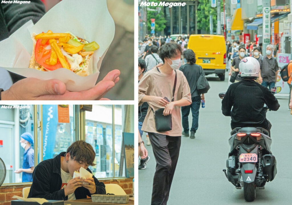 歩行者が忙しなく行き交うアキバの路地をスイスイ走り抜けて向かった先は、お気に入りのケバブ屋。こんなご時世なのでちゃんとマスクをつけつつも、いつでも陽気な店主に元気をもらえる個人的パワースポットで、名物となるケバブの上にはフレッシュトマトやポテト、ピクルスが乗っており、辛口〜甘口までの辛さから選べるほか、ガーリックソースなどの珍しい変わりダネメニューも絶品。こういった路地裏にある店に車や大型バイクで入っていくのは結構億劫になってしまい、家から少し離れてしまうと小排気量クラスのバイクではなかなか来ずらく、お気に入りのお店ほど自宅から微妙な距離にあるものなのかもしれない。