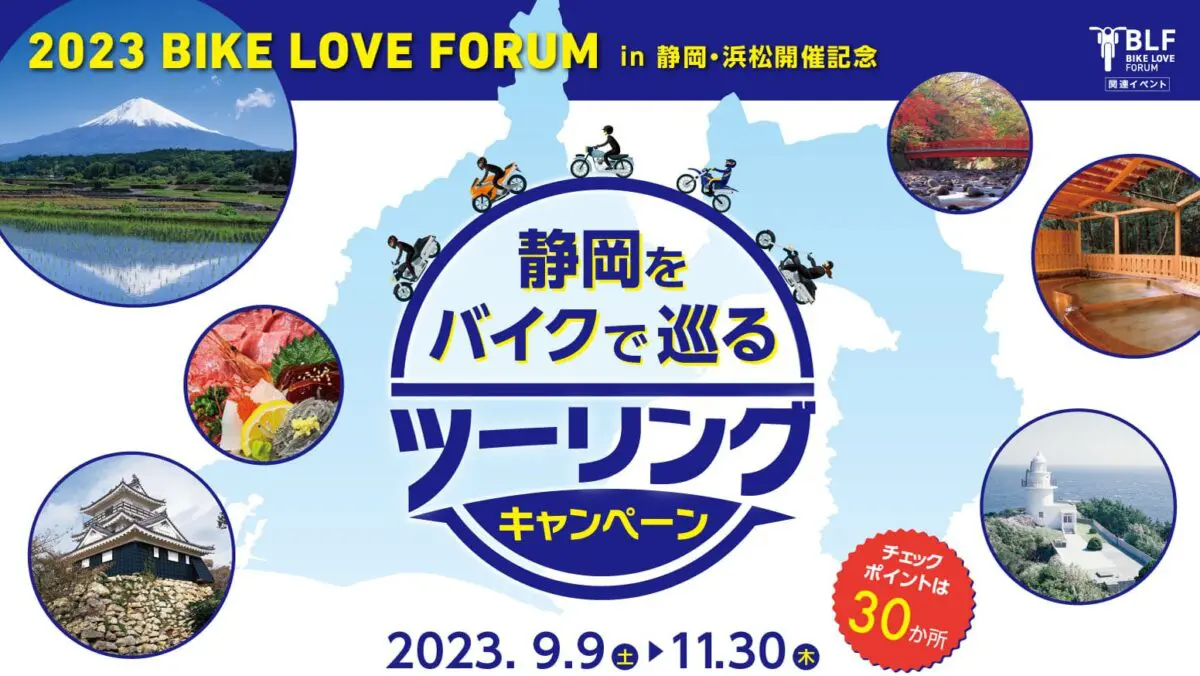 静岡をバイクで巡るツーリングキャンペーン実行委員会は、「第11回BIKE LOVE FORUM in 静岡・浜松」の開催を記念して、ライダーがバイクで自然を満喫できる「静岡をバイクで巡るツーリングキャンペーン」を2023年9月9日(土)から開催する。