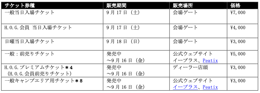 *4H.O.G.について詳しくは公式ページ(https://www.harley-davidson.com/jp/ja/content/hog.html)をご覧下さい。 なおH.O.G.メンバー入場チケットのお求めは、H.O.G.会員であることが必要となります。