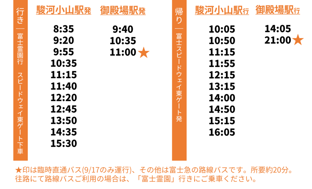 また公共交通機関でご来場のお客様向けに、9月17日(土)にはJR 御殿場駅と富士スピードウェイ東ゲート間でシャトルバスを増便にて 臨時運行します。路線バスと合わせた当日のバス時刻表については、 左図をご参照ください。