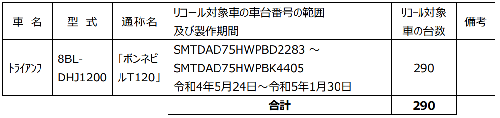 トライアンフモーターサイクルズジャパン株式会社(本社:東京都港区海岸 代表取締役社長:大貫陽介)は、次の内容をセーフティーリコールとして国土交通省へリコール届出をいたしました。