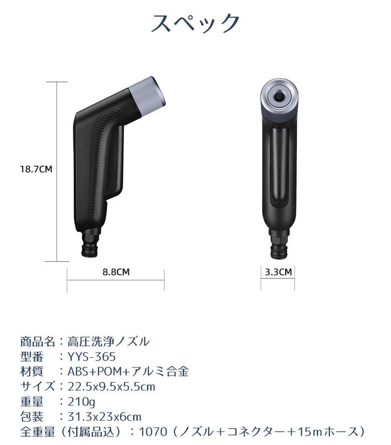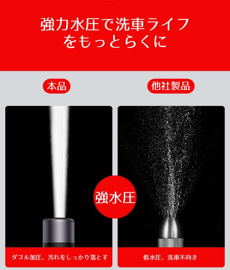 この商品はホースの先を水栓につなぐだけの簡単設置で、かさばるタンクや電源を必要とせずにパワフル噴射を可能としており、洗車や掃除など様々なシーンで活躍する。
