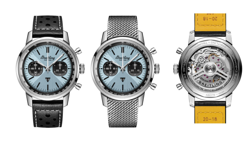 この2つのモデルは、1951年製トライアンフ サンダーバード6Tと、1970年代に製造された希少なブライトリング トップタイム Ref. 815のブルーダイヤルの色彩を正確に再現した独特のアイスブルーを配したダイヤルが特徴でした。