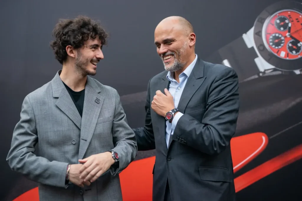 (左よりオートバイレーサー フランチェスコ・バニャイア、ブルガリ・グループ ウォッチ部門 マネージング・ディレクター アントワーヌ・パン)