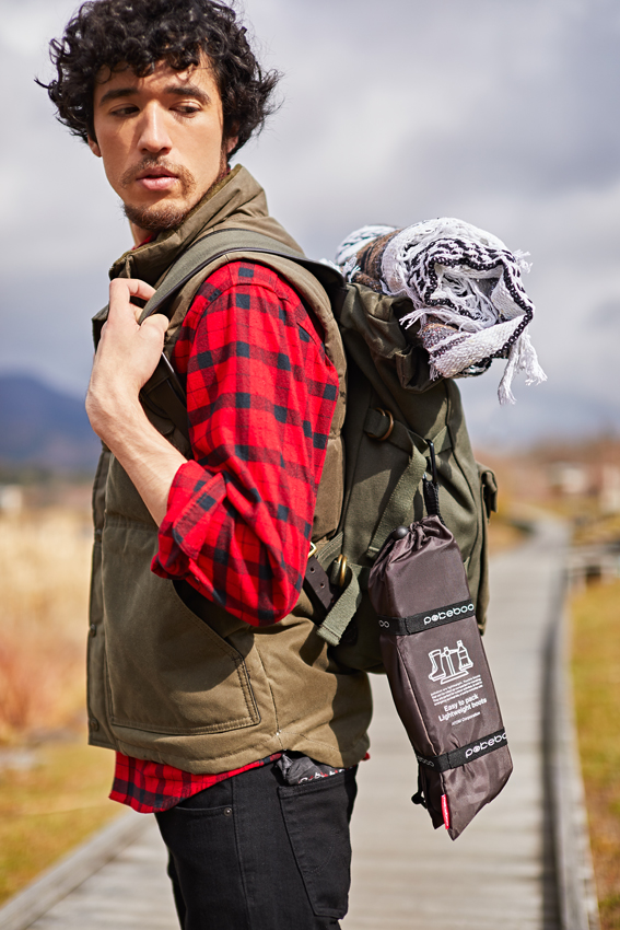 続いて軽くてコンパクトな携帯ブーツPOKEBOO。自然の中は天気がよくても夜露や泥でけっこう汚れちゃうから長靴があると便利。課題の積載もポケブーなら解決してくれる。グリップ力の高いラバーソール、天然ゴム使用の完全防水だから大雨でも安心だ。