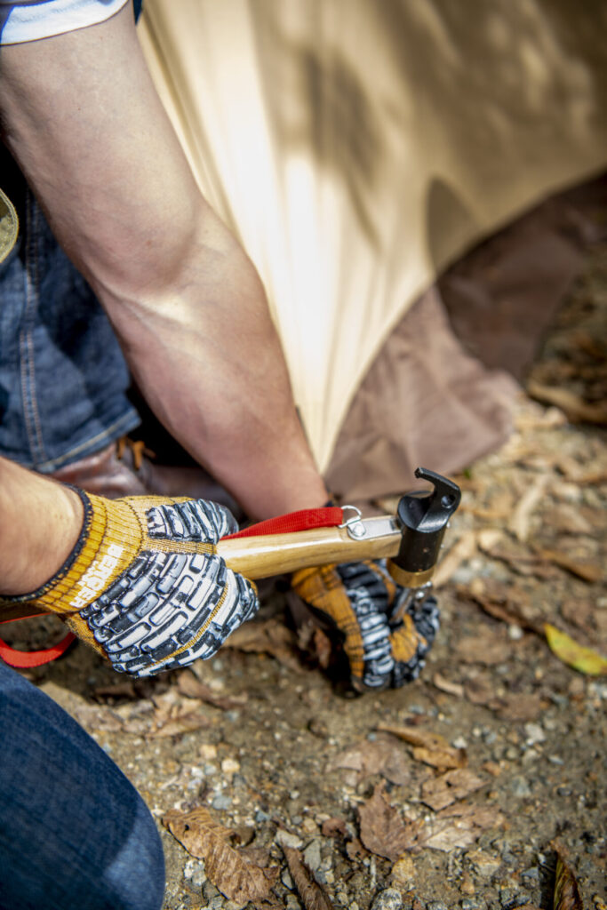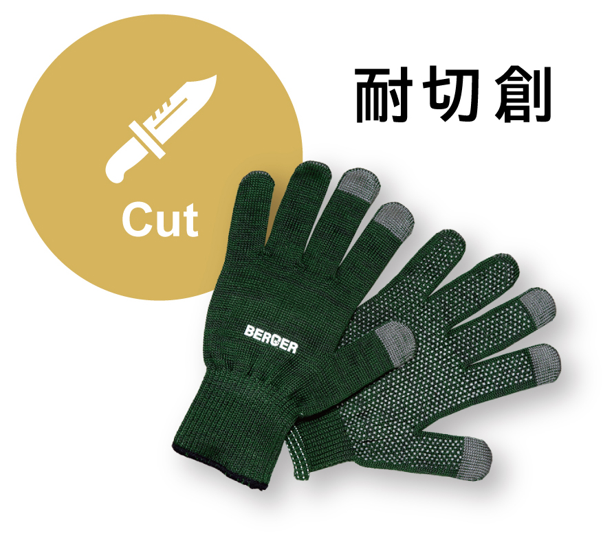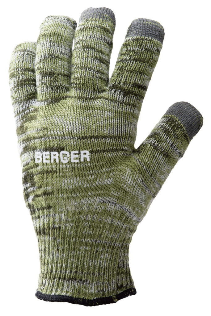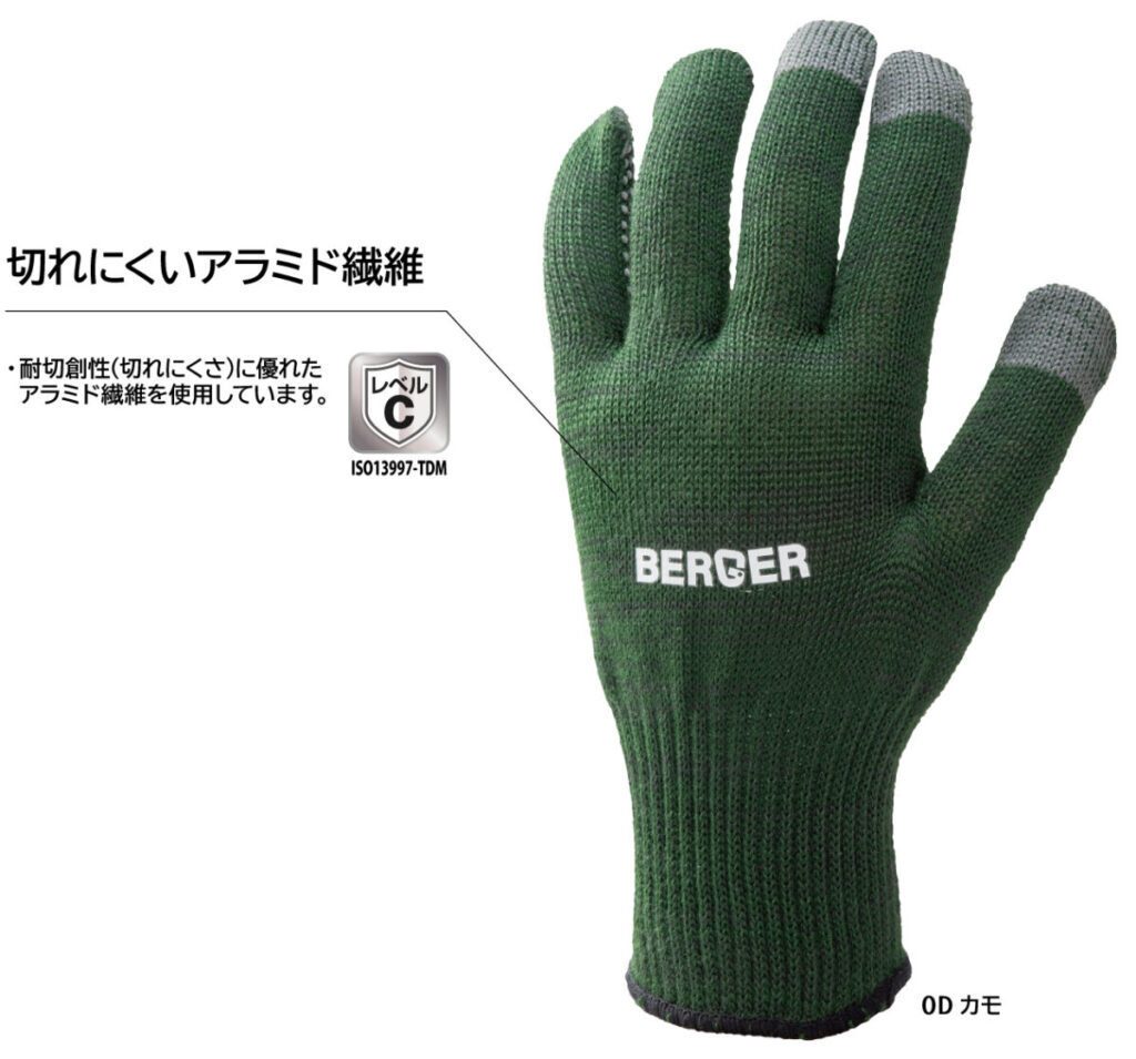 BERGER OUTDOOR GLOVESの機能軍手は3種。まずは打撃に強く面構えもインパクトなBG-1。手のひらはハイエンドなグリップ力がある。ナイフやナタを使うどっぷりキャンパーには耐切創が優れるBC-2がお勧め。 切れにくいアラミド繊維で作られている。最後は定番の焚火や調理時に必須なBC-3 。平は四層構造で熱をプロテクトしてくれる。