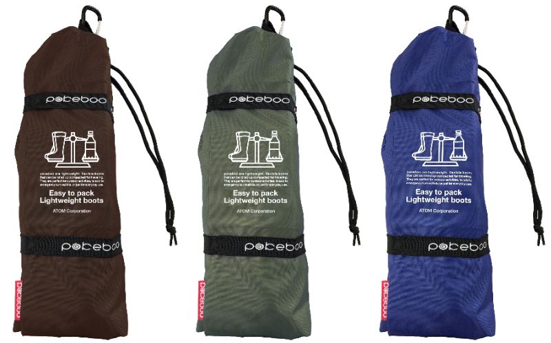 軽量でコンパクト収納も可能な長靴ポケブーは、グリップ力の高いラバーソール、アッパーには完全防水仕様の天然ゴムを採用し、あらゆるシーンに対応。専用の収納袋にはカラビナが付いており、持ち運びも便利である。