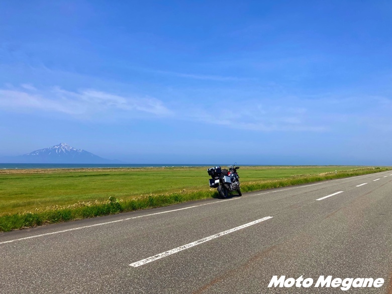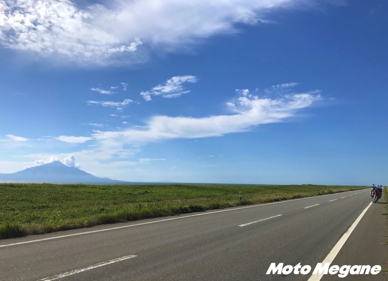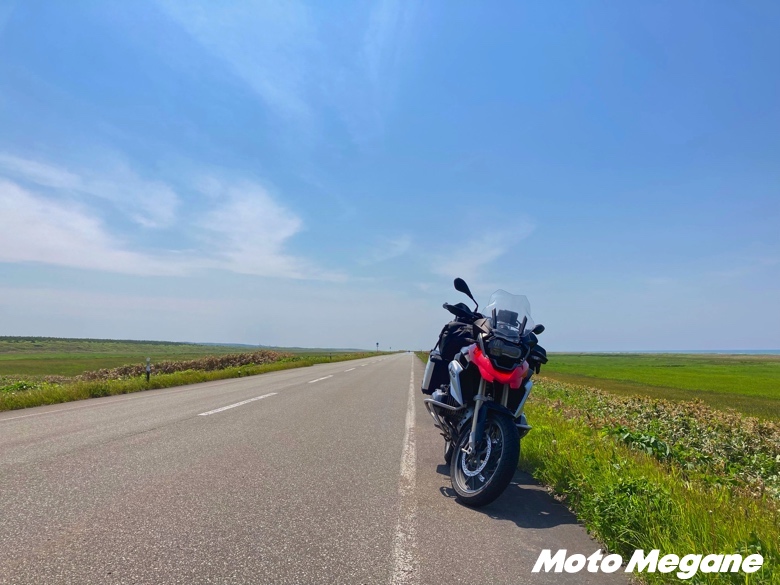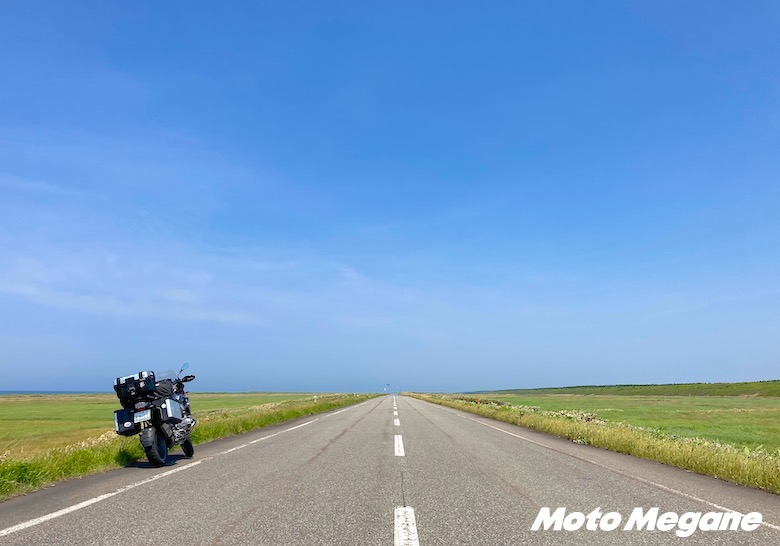 オトンルイに後ろ髪を引かれながら、再び走り出すと右手に雄大なサロベツ原野、左手に日本海と利尻富士、そして目の前に地平線まで続く直線道路という夢のスーパーコラボ区間が始まります!