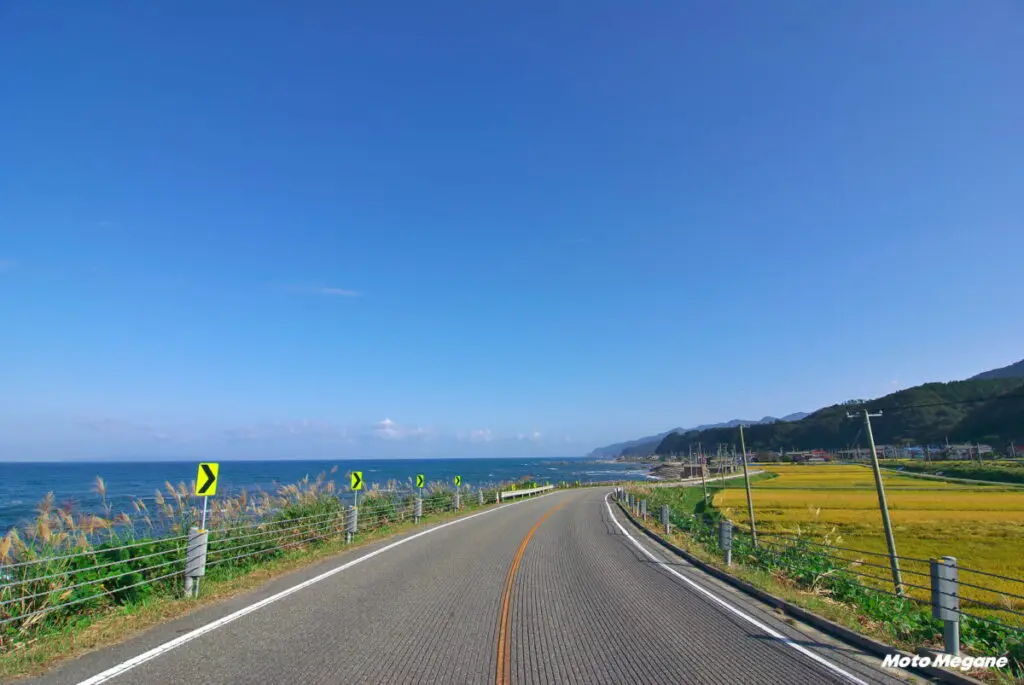 新潟県の村上市から鼠が関までの国道345号線を『笹川流れ』と呼んでいる。砂浜と奇岩が交互に続く変化に富んだ道で、岩の下をとおるトンネルなどが連続して楽しい。道の駅『笹川流れ』から北は、ほぼ海沿いを走る。お薦めは夏だが海水浴客が移動する時間を避けて昼間の時間を根払うか、可能なら週末をはずして走りたい。