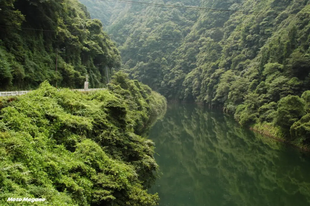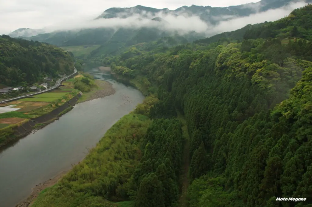 宮崎県を代表する觀光地を結ぶ完全2車線道路は整備の整備状況も素晴らしい。パイパスも作られて走りやすいが、渓谷美を味わうという点では寂しい気もする。左岸に点在する農村風景はゆっくりと時間をかけて回りたくなる魅力ある場所。