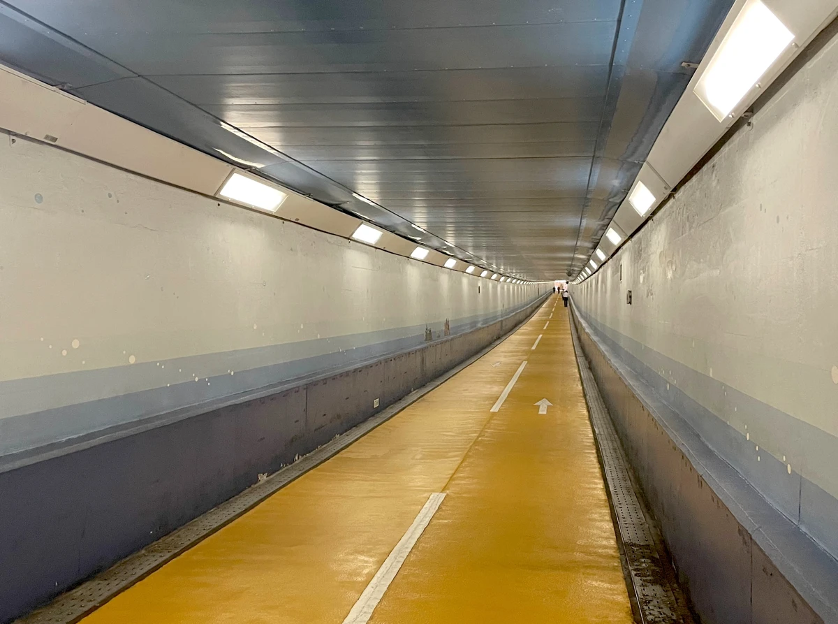 …あ〜あれあれ、あれね?海の上をシュタタタっっと華麗に歩く忍術的なやつね?…はい、違います…実は関門トンネルは「上部が車道・下部は歩道」という構造になっており、普通にトンネル内を歩いて通過することもできちゃうんです!