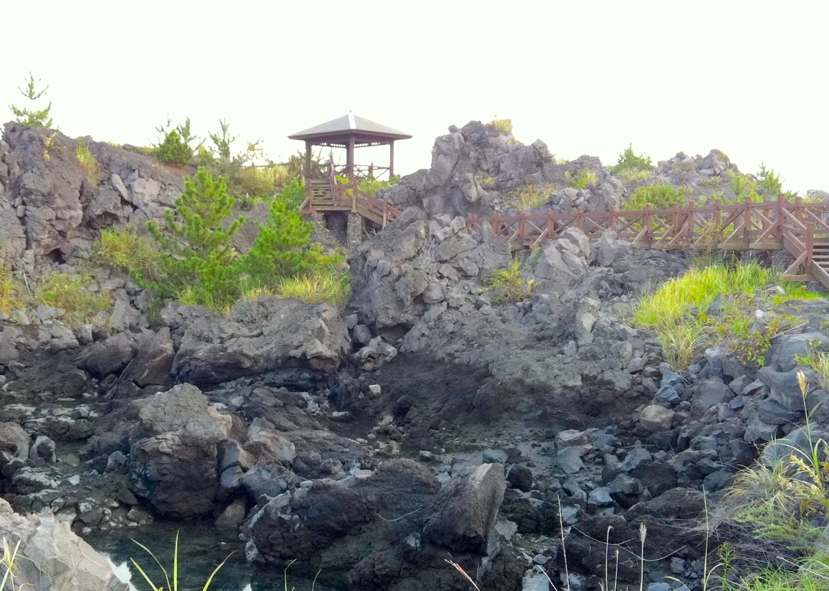 約1kmにわたって続く、その名も「溶岩遊歩道」を歩いた先にある展望台で、敷地内に広い駐車場と公衆トイレも完備されています。