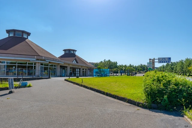 バイク専用の駐輪スペースが用意されている高規格な道の駅で、綺麗な公衆トイレに品揃え充実のショップ、そして海鮮料理店にカフェと必要十分な設備が整っています!