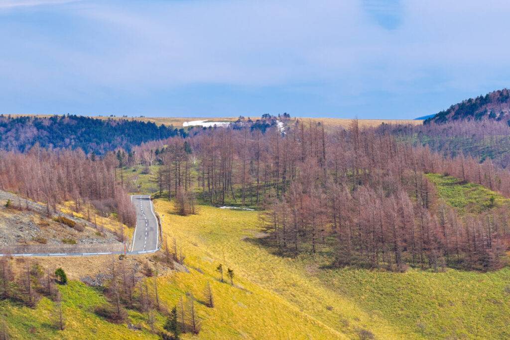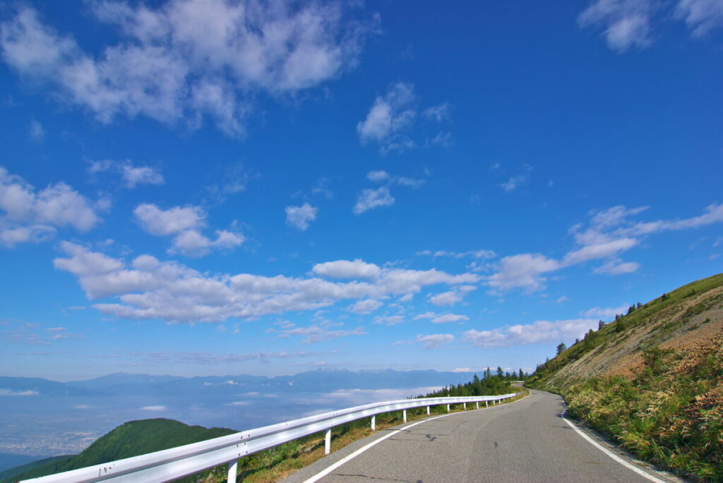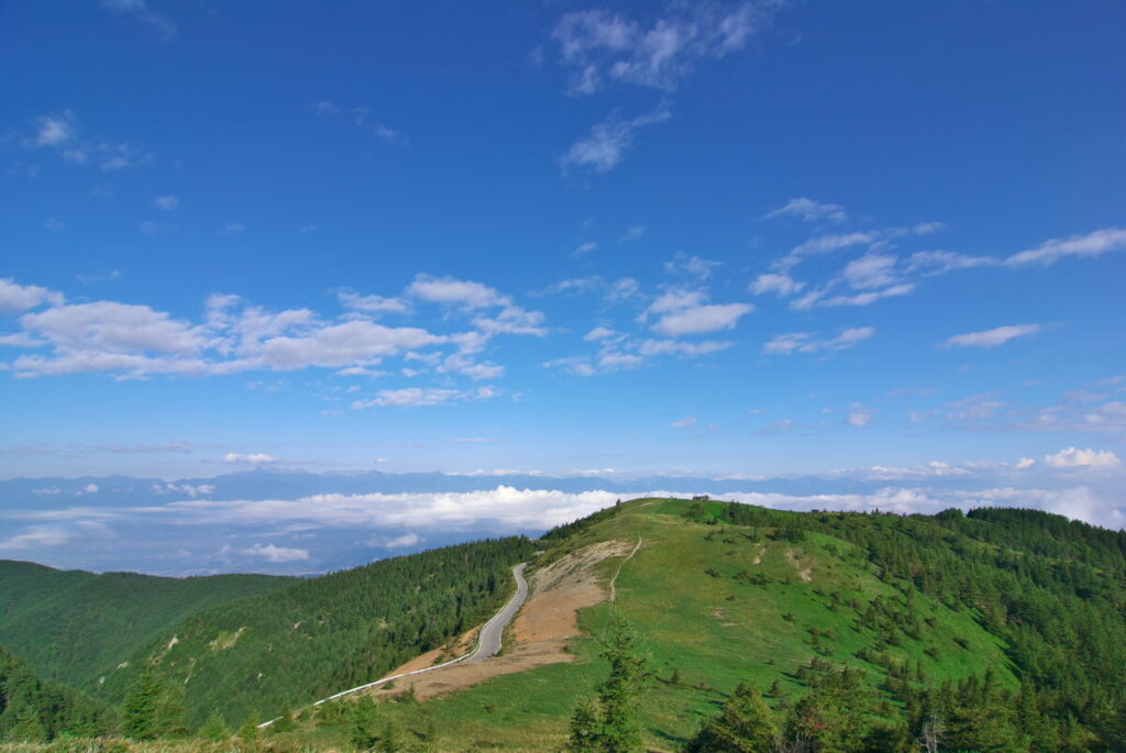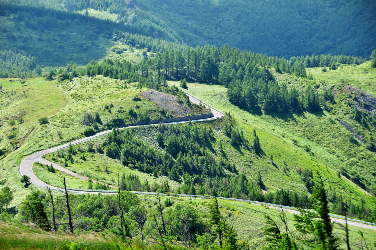 自然再生のため一部立ち入り禁止区域が設定されている絶壁上の区間は、北アルプスにつながるような天空の道で、ツーリング雑誌などでもよくとりあげられています。その後この道のハイライトがやって来ます。左カーブでカラマツの林が終わると、突然緑の牧草地をたたえた美ヶ原高原牧場の丘陵地帯を抜ける道が迎えてくれます。まるでヨーロッパの丘陵地を思わせる気持ちのいい景色が、ここから終点の自然保護センターまで続き、完全2車線の整備された快走路となっています。ヘアピンから直線道路、アップダウンのある楽しさが凝縮した道路で、この道がどこまでも続いて欲しいと思ってしまいますが、この最高の区間はわずか2キロほどなのがなんとも残念至極です。