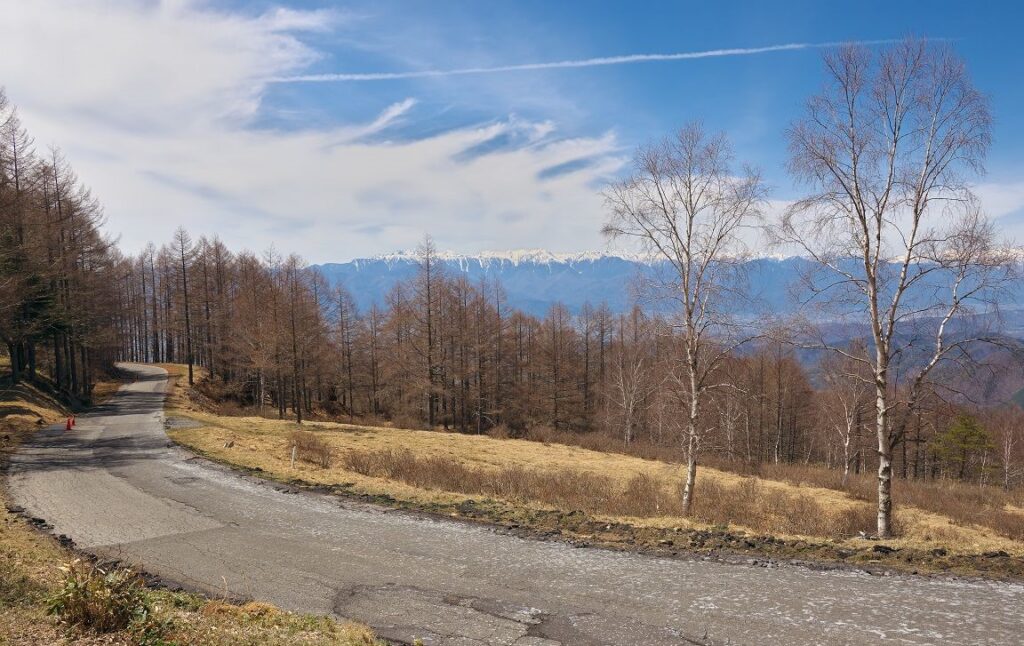 美鈴湖から武石峠まではカラマツの林の中を走るヘアピンカーブが続きます。道路は2車線レベルで整備されていて走りやすい道になっています。林道なので植林地帯の中を走りますが、伐採区間は松本盆地と北アルプスを眺望するポイントになっています。