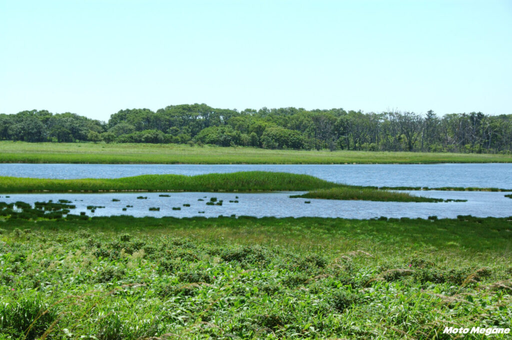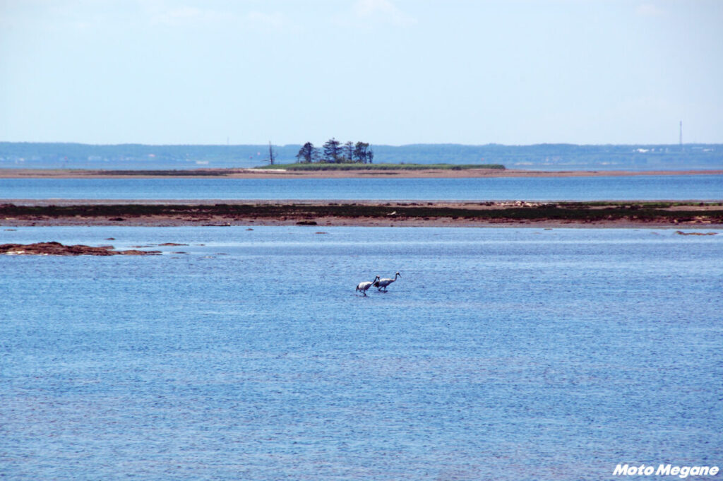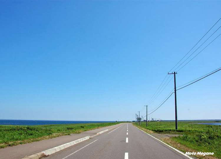日本最長の砂嘴(さし)地形の半島である野付半島は、ライダーの聖地の開陽台からほど近い標津の東から始まる。砂嘴は沿岸の流れによって運ばれた砂が長い年月の中で堆積してつくられたもの。道路の北にオホーツク海、南に野付湾が広がり、最も細い場所では数十メートルという幅になっている。なにか堤防の上を走っている感覚に陥りそうになる。