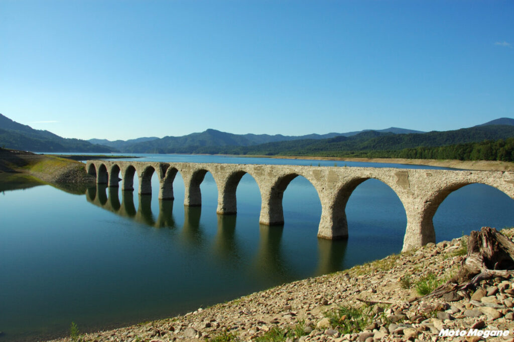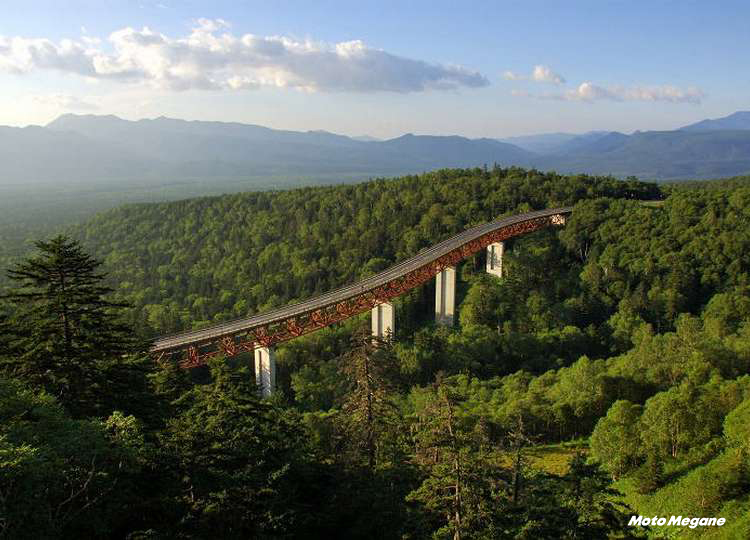 層雲峡から大雪湖を通って三国峠までは、山深い川沿いのルートで緩やかなカーブが連続し走りやすい。三国峠からは雄大な原生林を異物のような人工物であるいくつかの橋を下っていく。その後は、さわやかな白樺林の直線道路をクルージングしながら糠平湖に到着する。