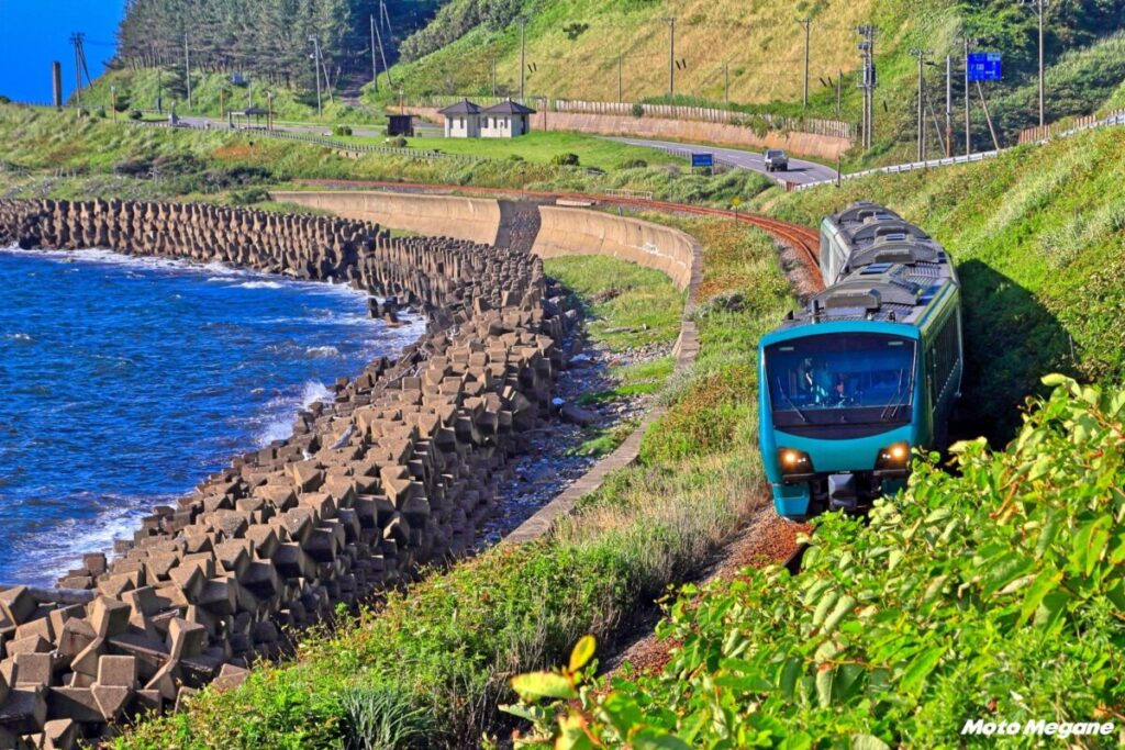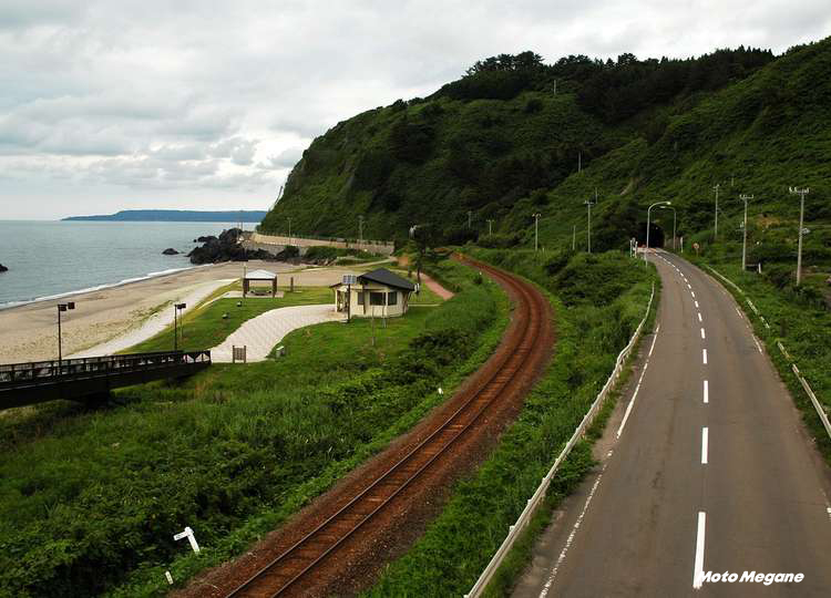 国道101号とほぼ並行して走る路線が五能線だ。道路、線路、海岸線が非常に近い距離なので、タイミングさえ合えば電車と並走ということもある。なお、この五能線を走っている「リゾートしらかみ」という列車があり、乗って楽しい列車をテーマに展望室、ボックス席、地酒等を販売しているカウンターが設けられている。ツーリングやドライブとはまた違った旅の楽しみ方をできるので、機会があったら乗ってみるのもいいだろう。