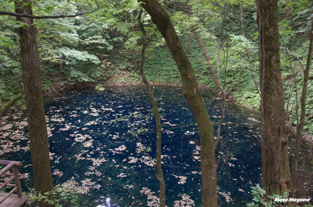 白神山地の西麓、ブナの森に包まれた33の湖沼が十二湖。湖沼群の東端に位置するのが青池。駐車場から徒歩10分。