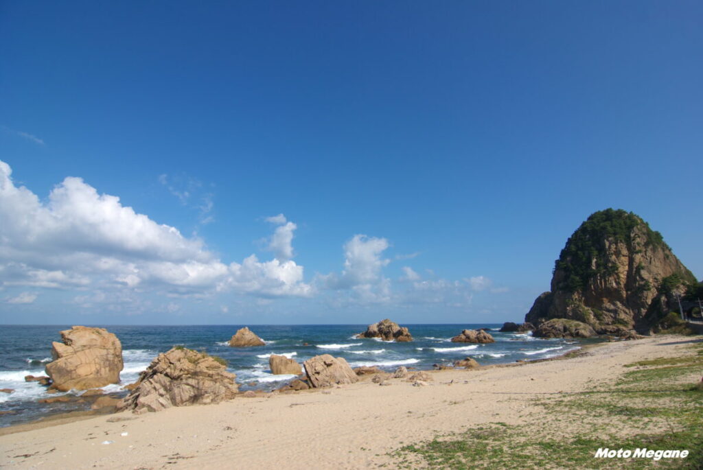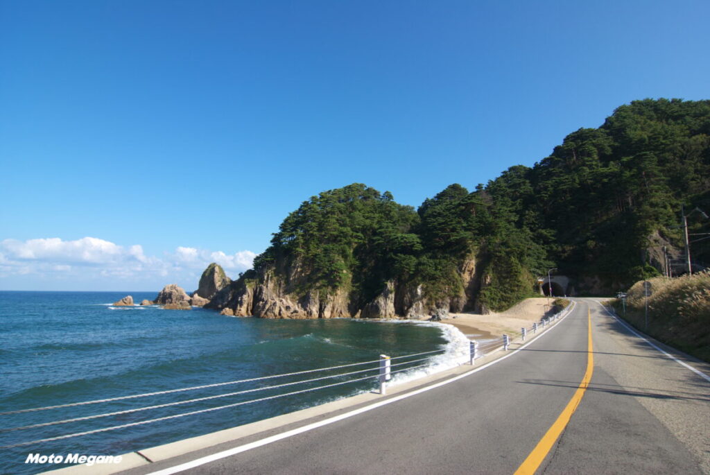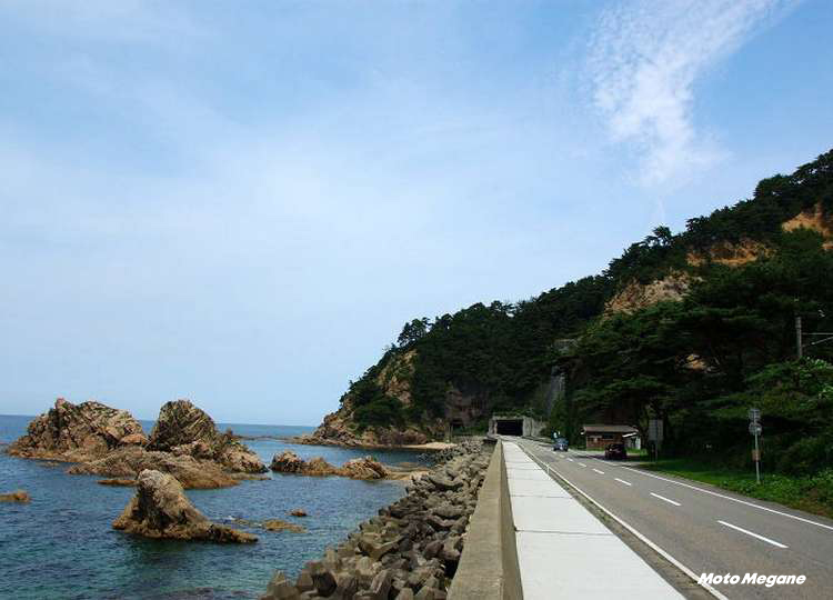 新潟県の村上市から鼠が関までの国道345号線を『笹川流れ』と呼んでいる。砂浜と奇岩が交互に続く変化に富んだ道で、岩の下をとおるトンネルなどが連続して楽しい。道の駅『笹川流れ』から北は、ほぼ海沿いを走る。お薦めは夏だが海水浴客が移動する時間を避けて昼間の時間を根払うか、可能なら週末をはずして走りたい。