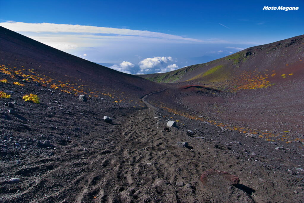 五合目から30分だけ富士登山をすると、あの巨大な宝永火口に到達できる。火口内部はまるでタレーター。快晴なら狙いたい。