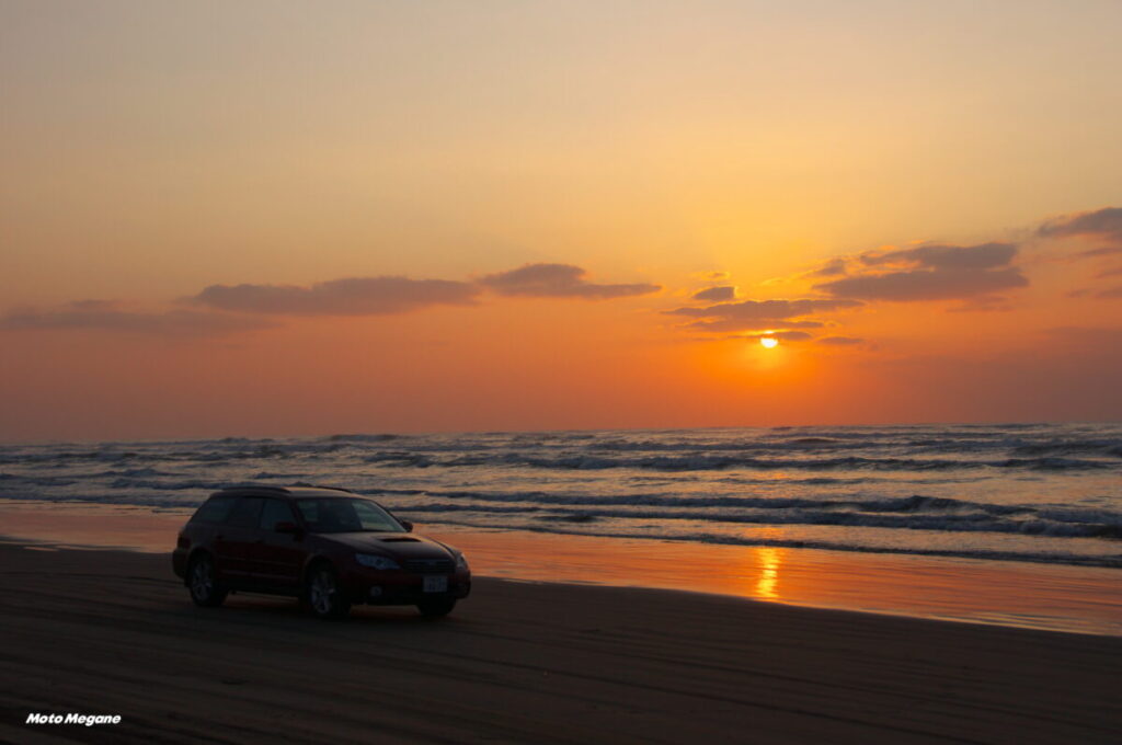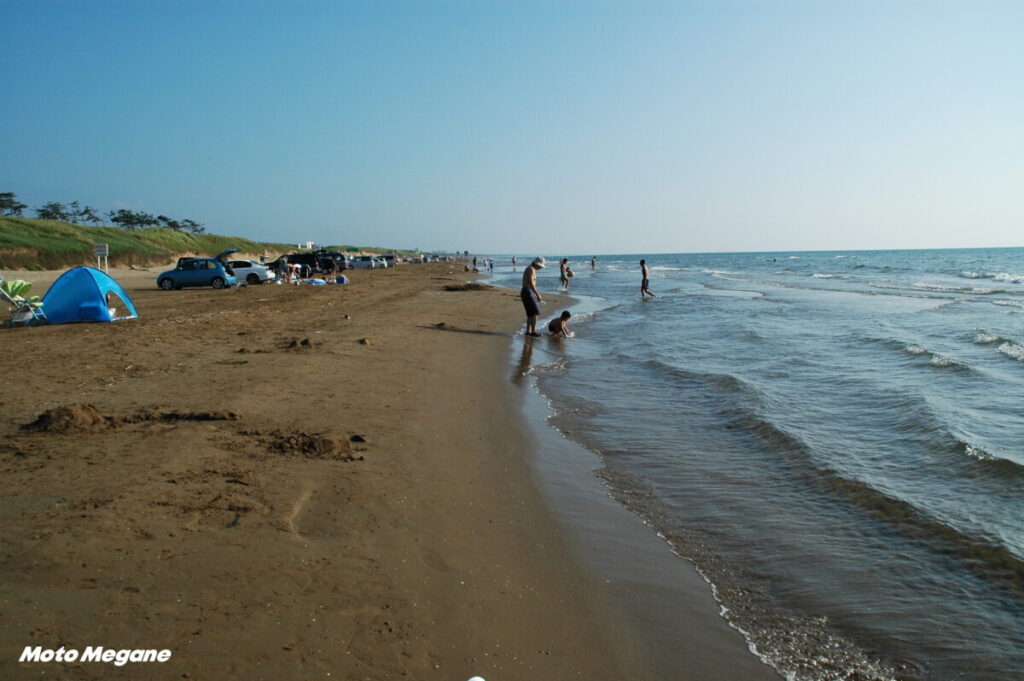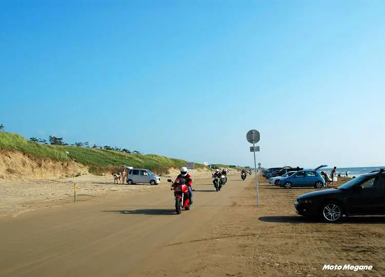一般的な砂浜と違い、ここの砂は粒が小さく大きさが揃っているため、水分を含むむと固く締まっている。そのためタイヤハウスに砂をばらまかず、かといってタイヤにへばりつくこともない不思議な砂浜だ。こんな砂浜は世界的にもアメリカのデイトナビーチ、ニュージーランドのワイタレレビーチを含めて3カ所しかない希有な道だ。