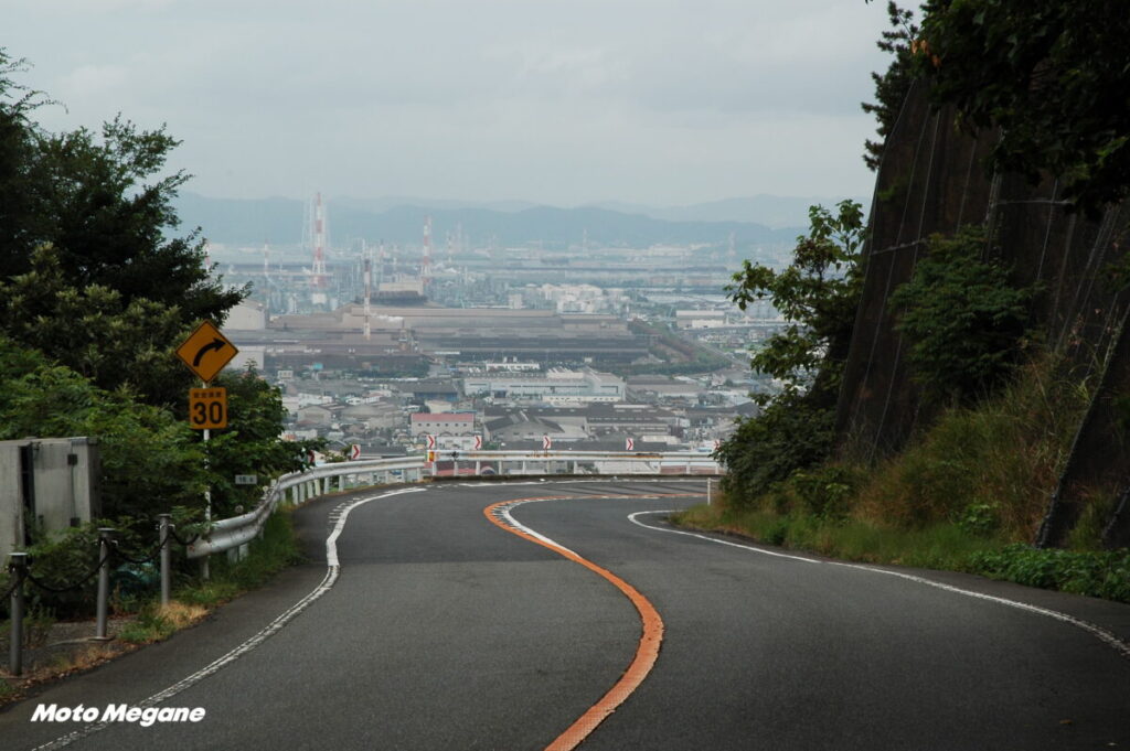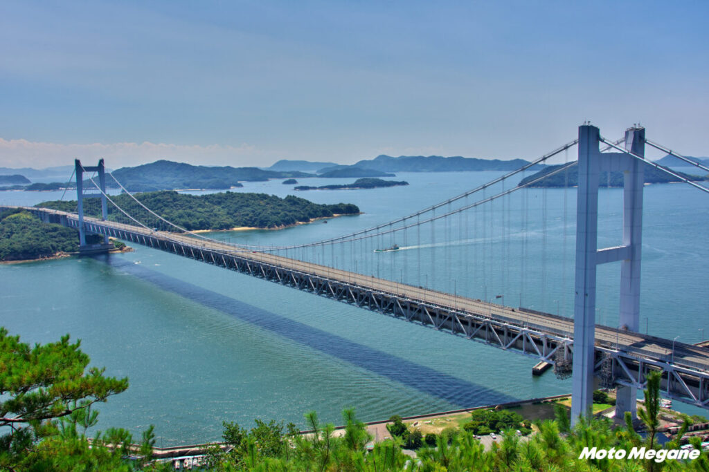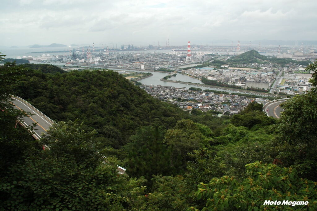 スカイラインの終点と鷲羽山展望台をつなぐのが県道21号だ。この道は距離は短いがスカイライン顔負けで、鷲羽山展望台から時計廻りに走ると、瀬戸内海を左に、瀬戸大橋がぐんぐん迫ってくる絶景ワインディング道路だ。途中にある瀬戸大橋展望所駐車場は、バイクや車と瀬戸大橋を間近に撮影できるお薦めの場所である。