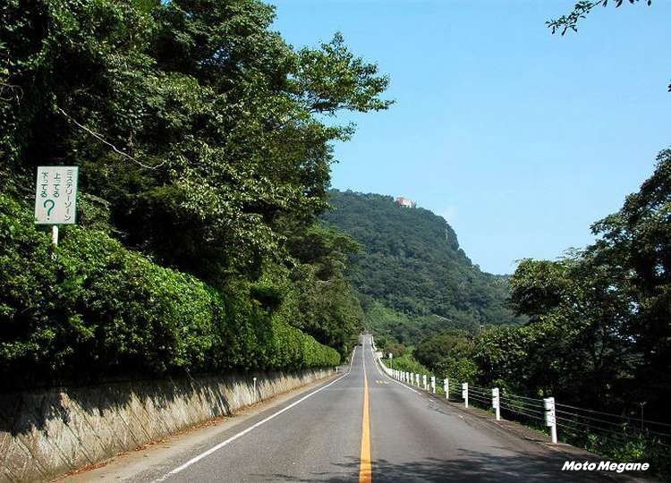 実際は上り坂なのに下り坂に見える場所。スタートから約1.6キロ地点。数あるミステリーゾーンで一番有名。
