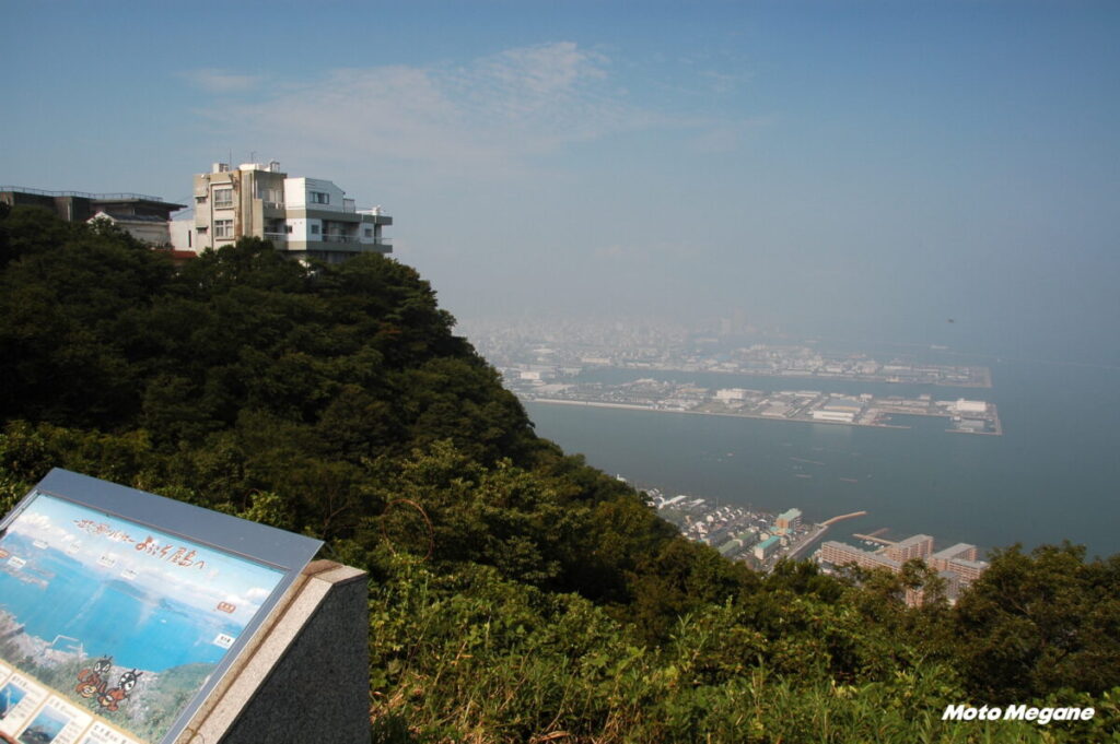 ドライブウェイの途中では瀬戸内海を展望できる東斜面の二か所に展望駐車場が用意されている。この駐車場からは源平合戦の讃岐屋島古戦場と五剣山が眺望できる。