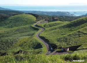 強烈な赤い平戸大橋を渡って左折してしばらく進み上大垣交差点を右折して内陸に向かって行く。案内看板が少なくわかりにくいが、狭い道が続いた後突然大草原の中を走る道に変貌する。すぐにビジターセンターがあり駐車場も完備している。そこから丘の上にあがってツーリング仲間と走行動画を撮ってもいいし、のんびりと時間を過ごすのにもよい場所だ。