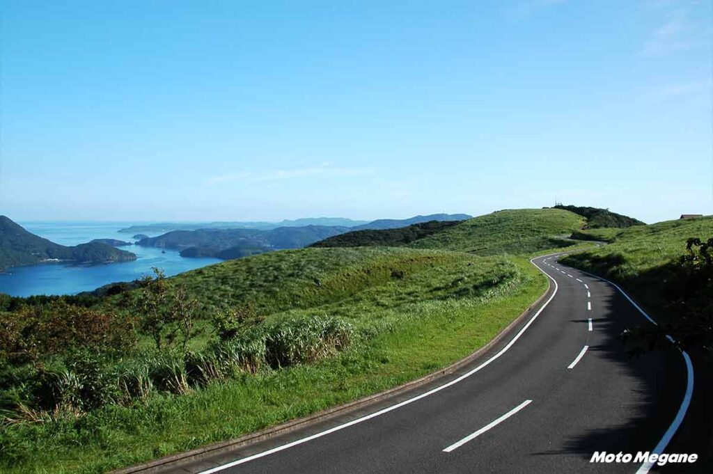 長崎県の西の端の平戸と生月の2つの島には、絶景道路と絶景地が多い。平戸では、最高峰の鯛の鼻、県道19号沿いにある景色抜群の平戸風力発電所と美しい砂浜(人津久浜)は是非立ち寄ってもらいたい。また、生月の生月大橋を渡って島の西岸をはしる生月サンセットウェイは、走りと景色を両立する超お薦めのシーサイドロードだ。南太平洋の孤島を思わせる断崖下の道路、棚田と断崖上を走る道路は本当に素晴らしい。距離も短いので何度も往復したくなる道である。午前中は日陰になるので、緑の豊かさを感じるなら午後からがいいだろう、名前のとおり夕陽も絶品。