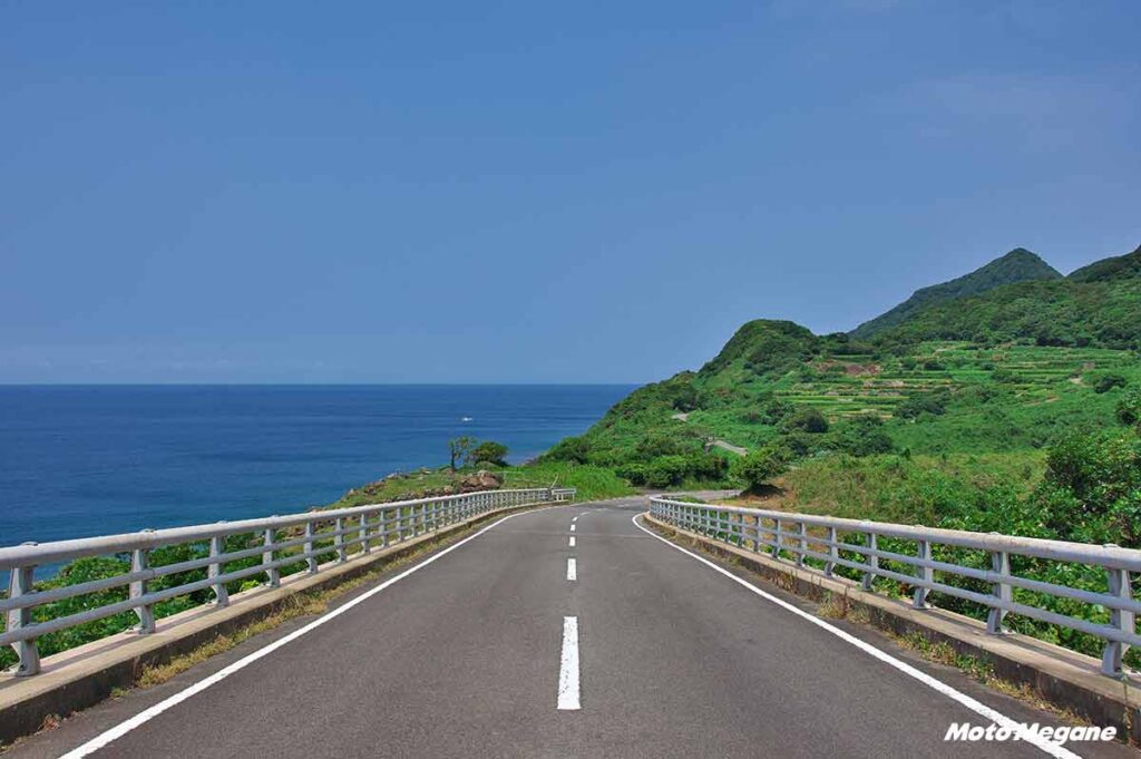 島西岸を走る農免農道。東シナ海と棚田、南太平洋の孤島を思わせる断崖下の道路は、距離は短いが走りと景色を両立した国内屈指のシーサイドロード。