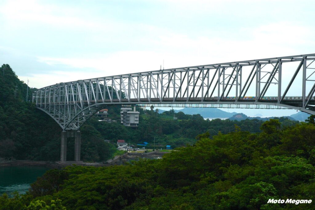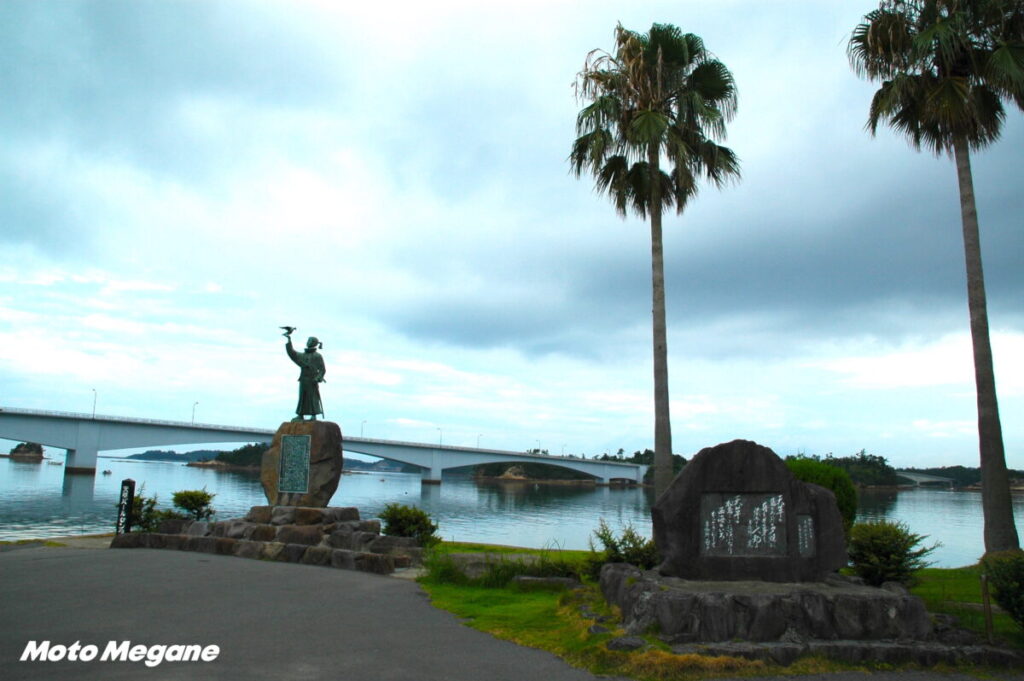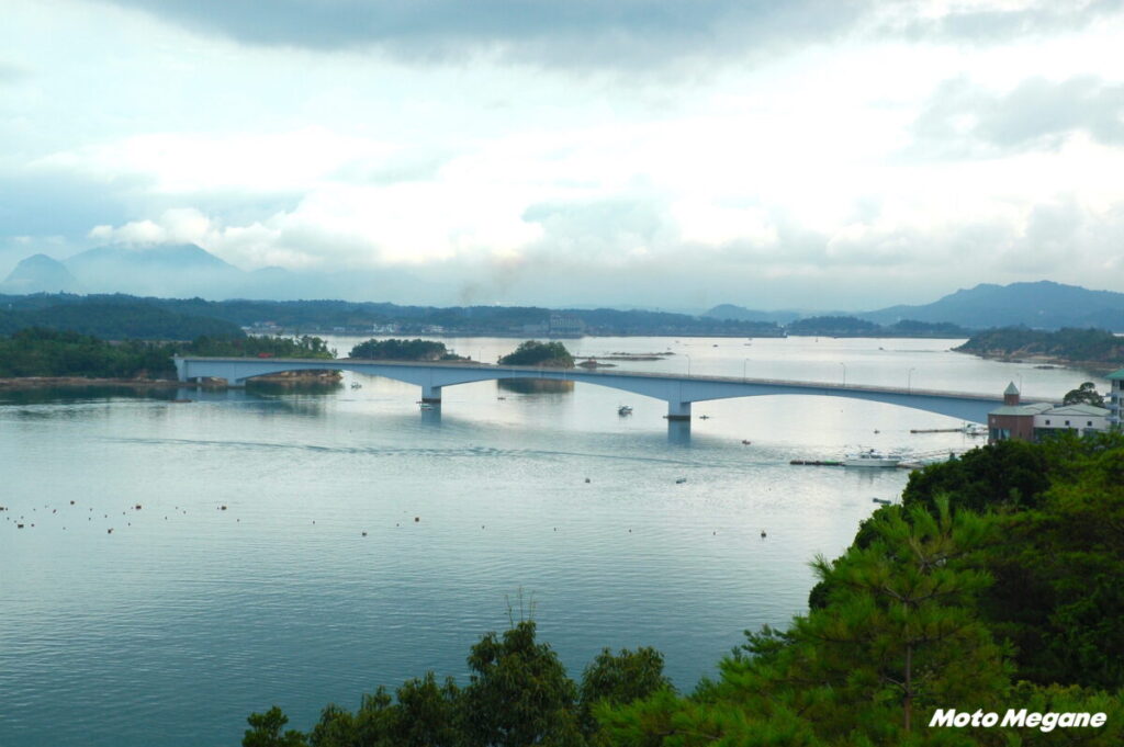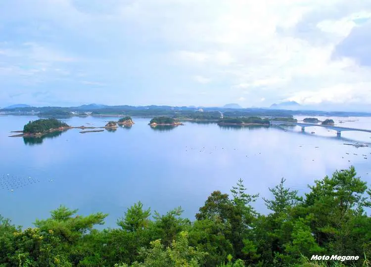 熊本市方面からは、宇土半島を南北の海岸線の道路のいずれかで向うことになる。いずれも海岸を走る爽快ロードだ。そしてみすみICからいよいよ天草五橋の1号橋(天門橋)がはじまり、島の合間を紡ぐようにして道路を走る。残念ながらバイクに乗った状態では天草松島の全景を楽しむことはできないが、橋と島が連続する2号~5号橋は海を見ながらの爽快な区間。それぞれの橋のたもとには展望地が用意されている。一番の展望地が天草4号橋(前島橋)の松島展望地で、ここは写真撮影スポットとしても有名だ。