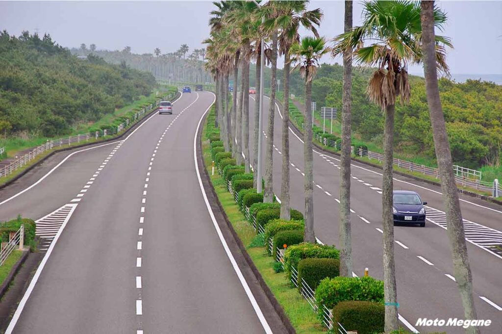 この道には、北側のシーガイアを含む宮崎リゾートの中心を走る一ツ葉道路と宮崎南パイパスから走りはじめるのがお薦め。フェニックスが並ぶ道路は、外国リゾートを思わせる大変美しい片側2車線の快走路だ。