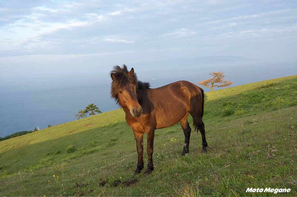 軽やかに走る野生馬が岬一帯に生息する。後ろから近づくのは禁止。草原の道は馬の糞だらけを覚悟すること。