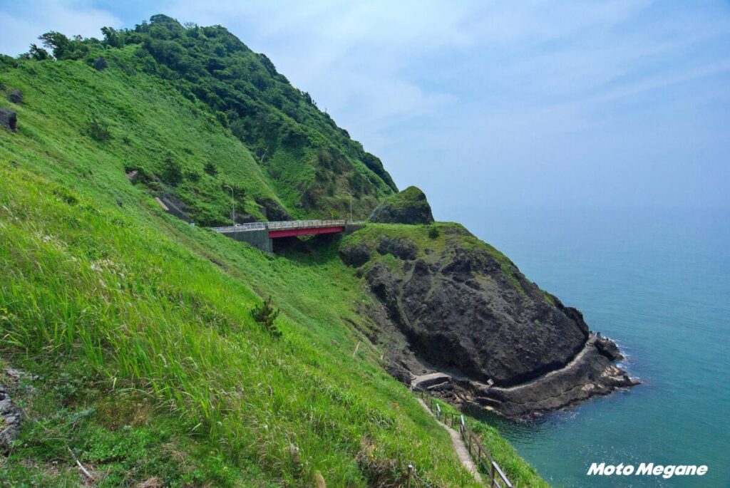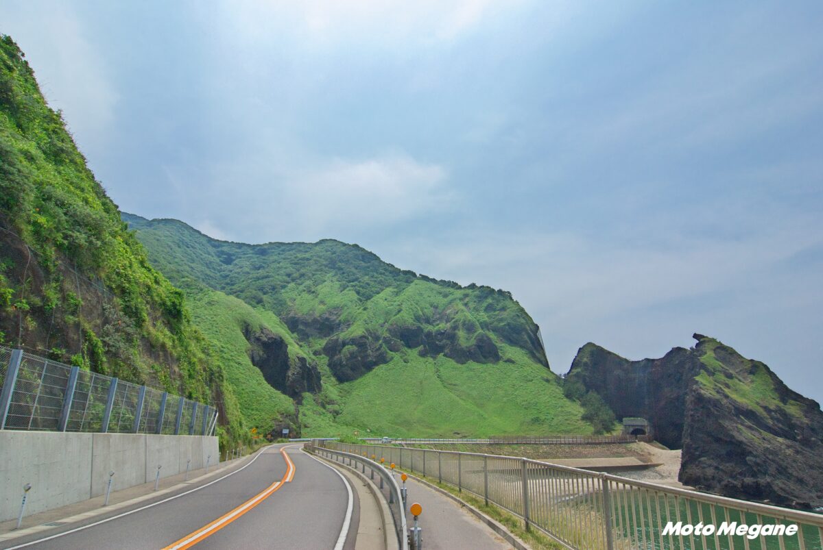 海岸線道路は海側を走り砂浜が広がる野積浜から北上する。砂浜が終わると立岩から始まる海岸線の奇岩が続き獅子が鼻に展望駐車場がある。間瀬海岸には枕状溶岩や開放的なこめぐりの郷公園やシーサイドパークがあり、海の景色にひたりながら休憩には最適だろう。また山側には日本海間瀬サーキットがあるので腕試しや見学も可能だ。そこを過ぎると道路は角見海岸(かくみかいがん)を離れ山沿いを2つのトンネルで抜けていく。実はかつて角海浜には東北力電力巻原子力発電所の誘致計画があったため、集落は移転し廃村となり、道路は山側を回り込むルートになった。その後、1996年に住民投票結果に基づき誘致中止となり、この地域がそのまま残され現在では陸側からは近づけないという。