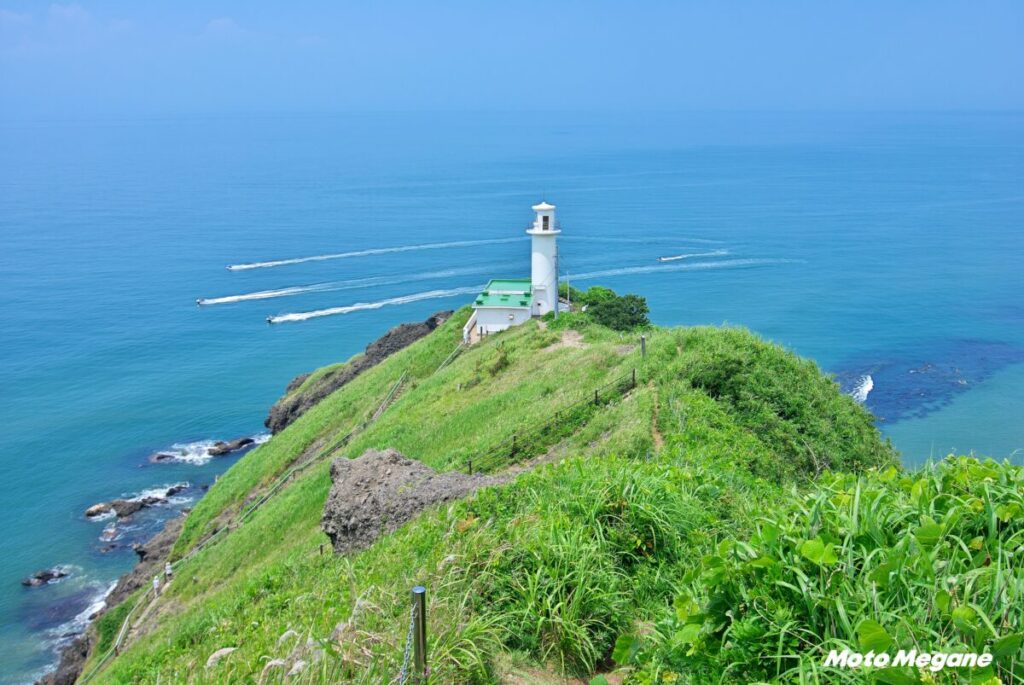 再び海沿いに戻った道路は、この道のハイライト区間に入る。浦浜海水浴場を過ぎると、俵岩、雷岩の巨大な奇岩の真っ只中を走る驚愕の絶景ワインディングになる。この道があと5km長ければ文句無しの絶景シーサイドロードになって、ツーリング系の絶景ロード特集の上位に間違いなく入るだろう。せめて角海浜の海岸を走ってくれたらと思う。終点の角田浜には白亜の美しい灯台がある。やや険しい階段を登って日本海を見下ろす灯台の景色を眺めて欲しい。