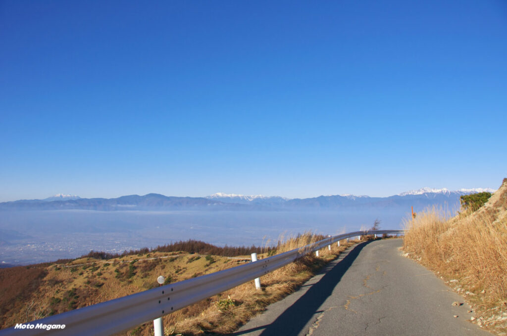 鉢伏山へは、高ボッチからさらに北へ向って鉢伏高原スカイラインを走る。名前に負けない展望を誇る道だが、道幅の整備状態は林道クラスで、離合はなかなか厳しい場所も多くある。それでも、富士山から北アルプスをほぼ俯瞰するこの道は何物にも代えがたい。特に下りは、絶景スカイラインの魅力を100%感じるに違いない。終点の鉢伏山荘の駐車場(500円)に車をとめて、登山道(ハイキング程度)を1km20分歩くと素晴らしい絶景が待っている。ここに来たら、ぜひ登山もセットにしたい。