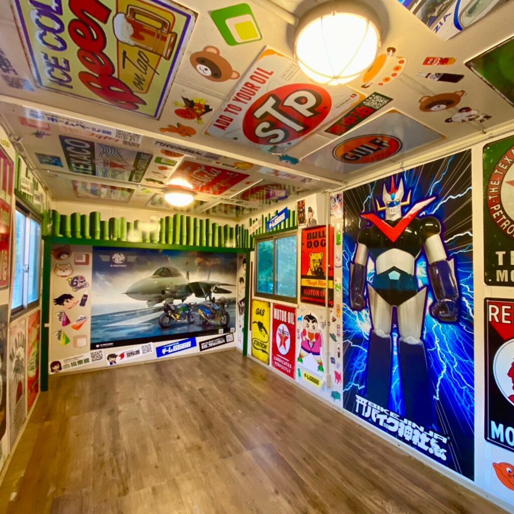 神社に来たら普通、お賽銭をして手を合わせますが、こちらの神社、神社は神社でも、ちょっと違ってるんです。バイクに関係する人達が自由に集まれる「神社の境内」がコンセプトで「神社」って名前が付いてますが、ホンモノの神社仏閣ではなく、バイクライフを少しでも楽しくオシャレに、有益情報や掘り出し物を簡単にゲットできる場所になって欲しいと願っての名前だそう。子供の頃、近所の神社に行けば、遊び友達がいたり、かくれんぼしたり親に黙って捨て犬を飼ったり…いっぱいわくわくしてましたよね。 そんな場所にしたくて「神社」って名乗ってるそうです。なので、お賽銭箱がないんですって。
