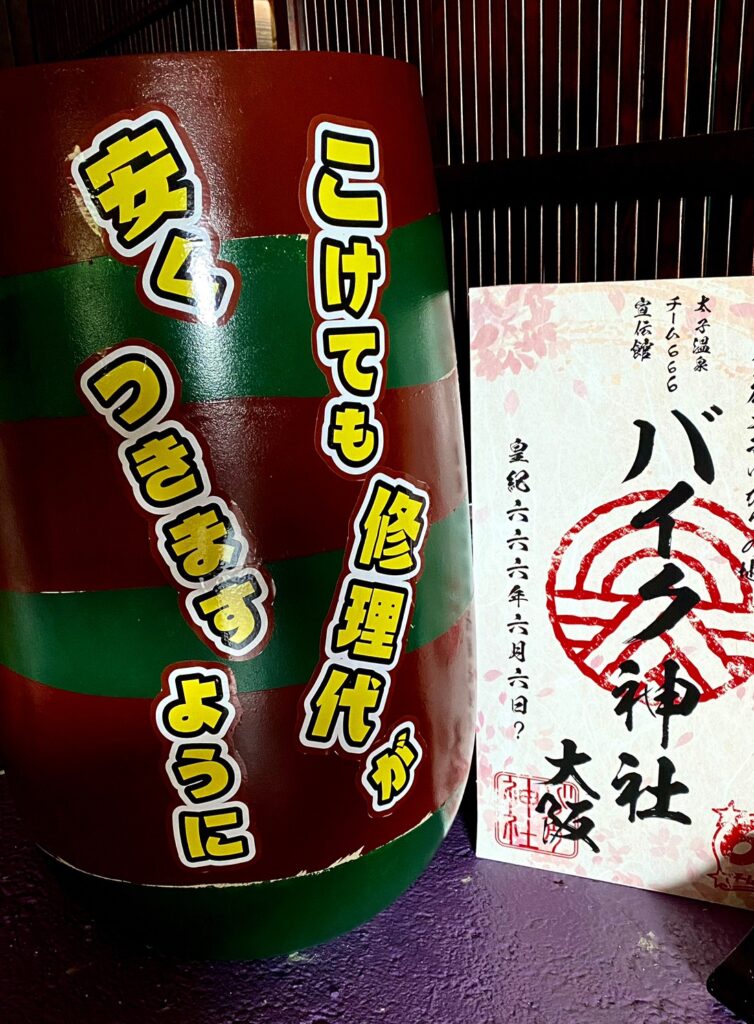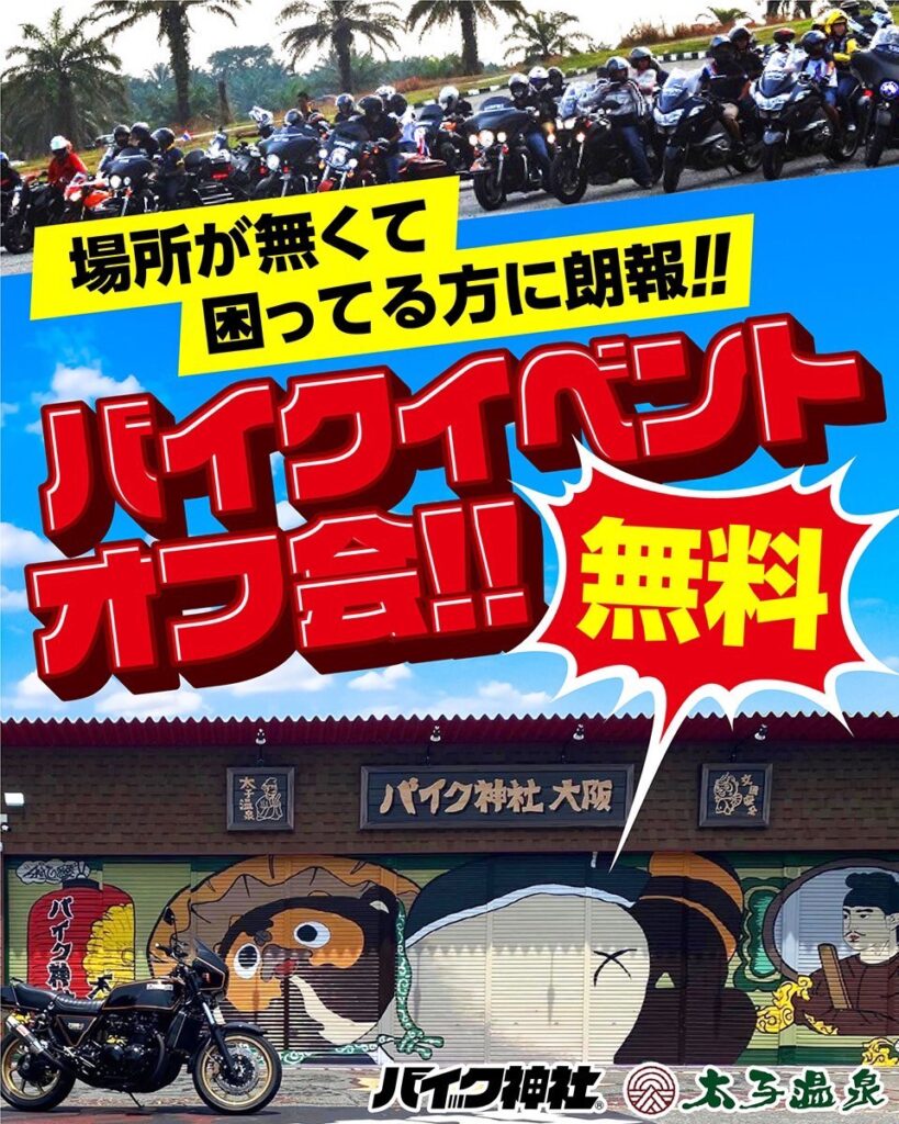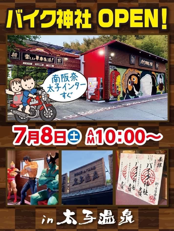 2023年7月8日(土)太子温泉に「バイク神社」がオープンするということで、どんなところなのかと検索してみると、温泉?畳スペースにテレビや漫画にケンシロウ?あまりに情報量が多すぎて、ここはいったいなに?神社じゃないの?などなど、あたくし、何がなんやらわからなくなりまして、もう、これは、大阪バイク神社の岡田社長に聞かないとわからない!っと、直接お話しを聞かせて頂くことにしました。