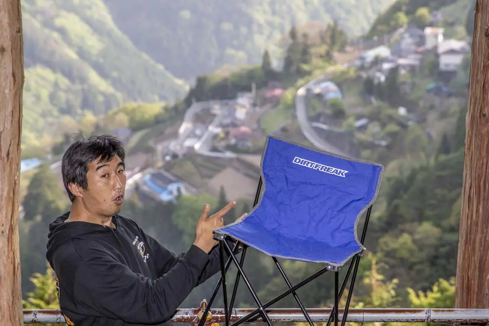 一般的には車で行くことが多いようなのですが、ここではもちろんバイクで楽しみたいと思います。チェアリングのスタートはまず、自分のお気に入りの椅子を探すところから、なのですが、ここではダートフリークから発売している「折りたたみチェアー」を使います。これを林道ツーリングに行く際に積んでいけば、林道で出会う絶景をみながら最高にくつろぐことができてしまうというワケです。
