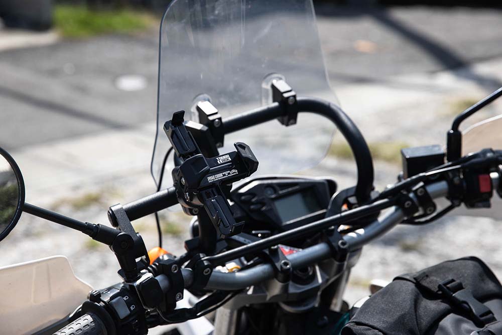 さて、ツーリングを始める前にパッキング。マップを使用するためのスマートフォンホルダーはZETAから新登場した「タフロック スマートフォンマウント」を使います。ラバーマウントが回転することで携帯に伝わる衝撃を軽減。さらにボールマウントによって角度を自由に変更できるのも嬉しいポイントです。乗車時の振動によってが落ちることも傾くこともなく、安定感も抜群でした!