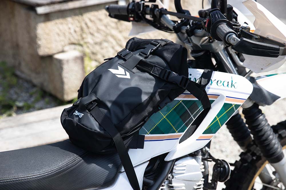 貴重品や飲み物、着替えなどは「DFG モジュールモトパック」にパッキング。30L/15L/7.5Lと収納量別に3タイプ展開されているため、荷物の量に合わせて使い分けられるのはとてもありがたいです。今回はますきちさんに1泊してからのツーリングということで、着替えを持ち運ぶためにも30Lと7.5Lの2つを使用。着替えなどを入れた30Lをリアフェンダー部分にくくりつけ、手が届きやすいガソリンタンク上には7.5Lを装備し、財布や飲み物など、取り出す頻度の多いアイテムを入れておきました。