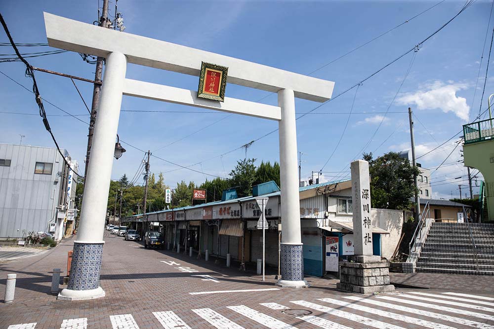 瀬戸にはいくつか商店街があります。最初に訪れたのは「宮前地下街」。入り口には深川神社の大きな鳥居がそびえ立っていて、その参道に並ぶお店が「宮前地下街」です。”地下街”という名前から地下にあると想像しますが、お店は全て地上に並んでいます。調べてみると、”地下”というのは神社から見て低い位置にあるから地下という名前がついているのだとか。