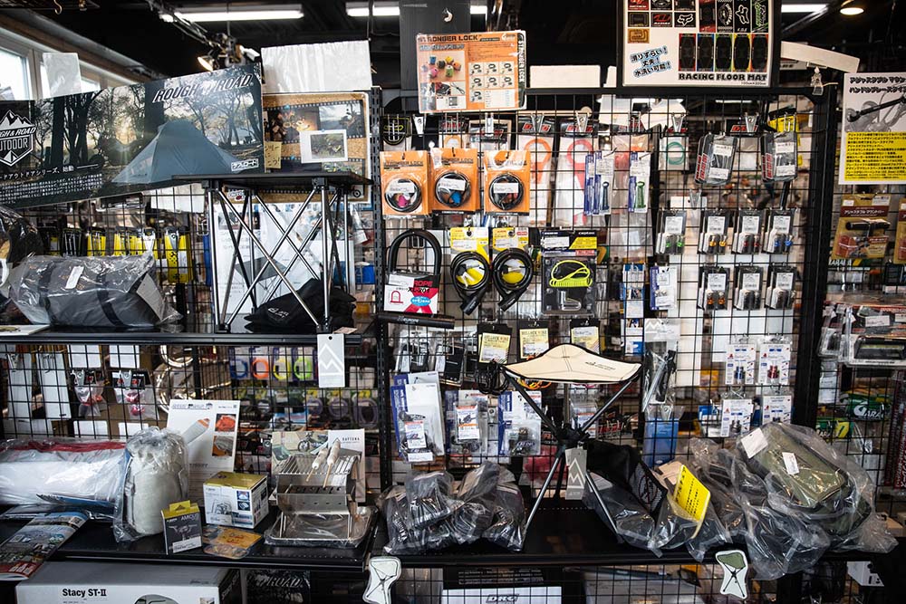 ダートバイクプラスは、ダートフリークの本社に併設されています。モトクロスやエンデューロなどオフロード用品はもちろん、ツーリング用品やキャンプ用品まで品揃えが豊富。組み立て式のテーブルやチェア、ミニ焚火台など、ツーリング先でキャンプを楽しむためのアイテムをほぼ揃えることができちゃいます。