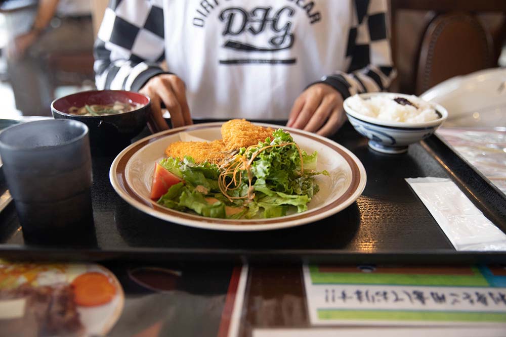 品野陶磁器センターに隣接するレストラン「敷島」で昼食をいただきます。カレーや味噌カツ、お寿司やケーキなど、メニューの多さに驚きました。お腹が空いていたので、ガッツリ揚げ物のアジフライを注文。ちなみに、愛知県といえばモーニングサービスが有名ですよね。喫茶店でドリンクを頼むとパンと茹で卵がついてきたりと、そのボリュームの多さやお得さは衝撃を受けるほど。「敷島」では、パンとゆで卵とお寿司2巻というボリューミーなモーニングセットも用意されていました。次はモーニングを目的に来てみたいです。