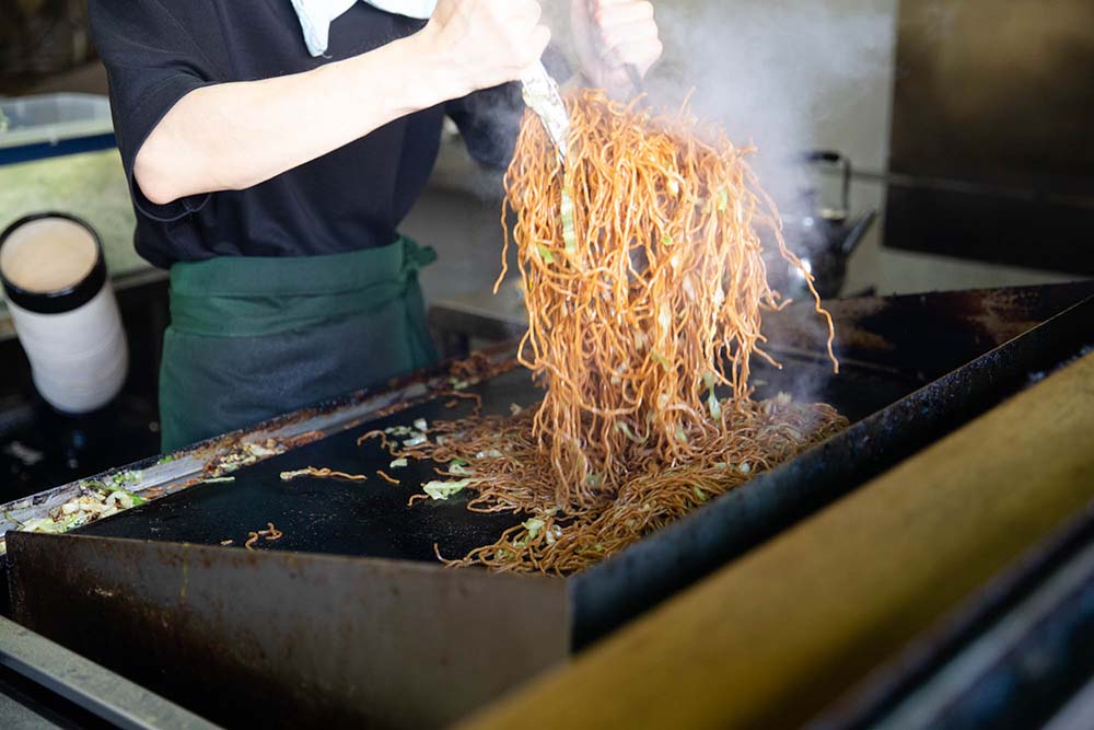 瀬戸のソウルフードとして有名な「瀬戸焼きそば」は瀬戸に来たら外せません。「焼きそば 一笑」は、地元の方からも愛される人気店で、混雑時には3時間以上待つこともしばしば。瀬戸焼きそばの最大の特徴は20分という炒め時間の長さとタレにあります。瀬戸焼きそばのタレは一般的なソースではなく、豚肉を醤油ダレで煮込み、その旨味を抽出した特製のタレを使用。20分以上という炒め時間の長さは、タレの旨味を麺にしみこませるための時間なのです。また、麺も瀬戸焼きそば専用のものを使っているため、長時間炒めてもコシのある食感で、一度食べるとやみつきになります。